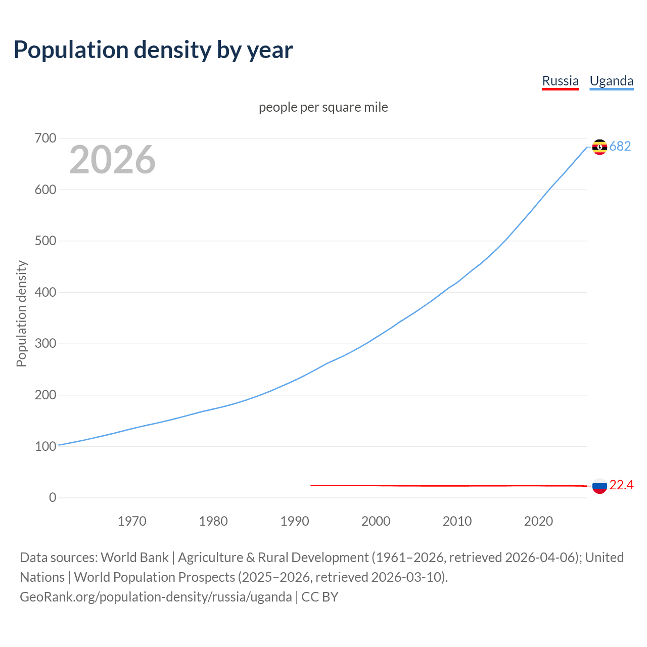 Russia has a population density of 22.4 people per square mile compared to 682 people in Uganda. Russia has 1,280,521 sq ft of land per person vs 51,875 sq ft in Uganda. Russia and Uganda rank 186th and 42nd by population density, respectively.