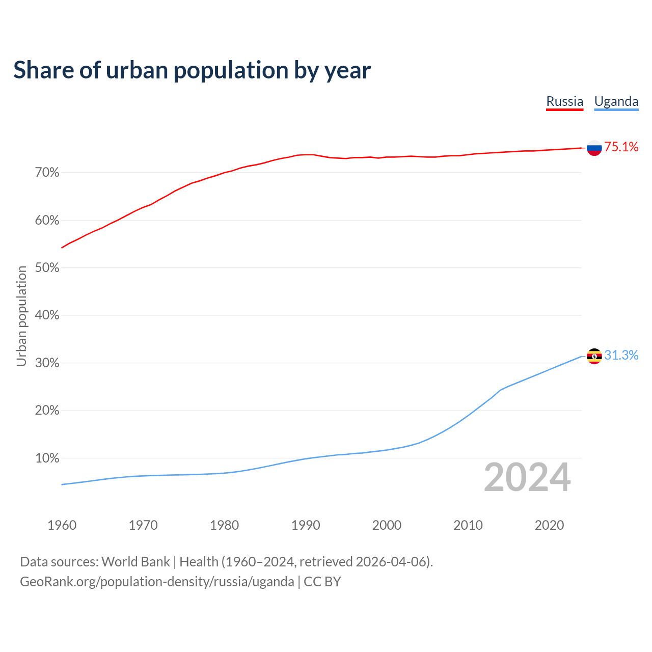 From 2004 to 2024, the share of urban population changed from 73.3% to 75.1% in Russia and from 13.1% to 31.3% in Uganda.