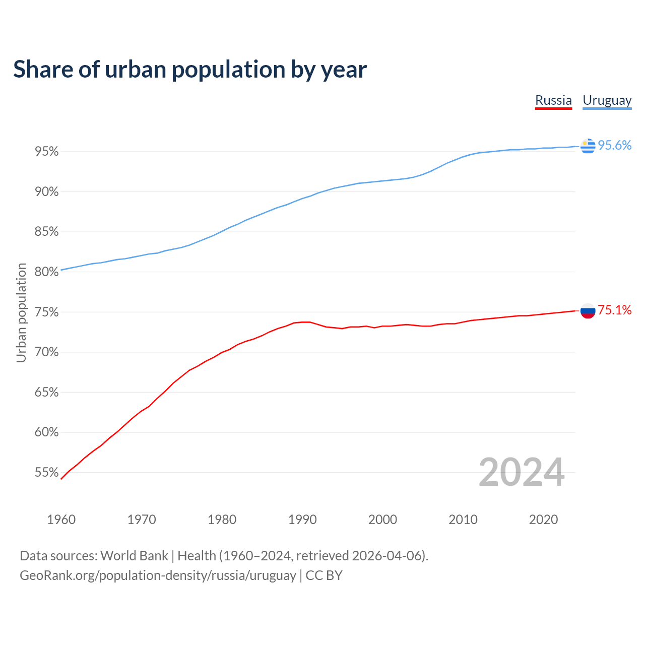 From 2004 to 2024, the share of urban population changed from 73.3% to 75.1% in Russia and from 91.8% to 95.6% in Uruguay.