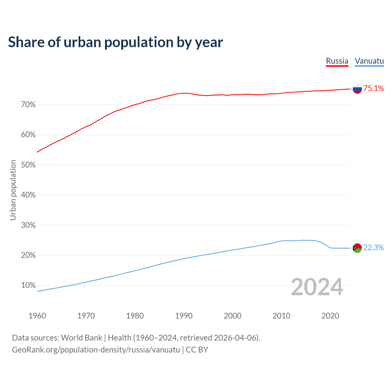 From 2004 to 2024, the share of urban population changed from 73.3% to 75.1% in Russia and from 22.7% to 22.3% in Vanuatu.