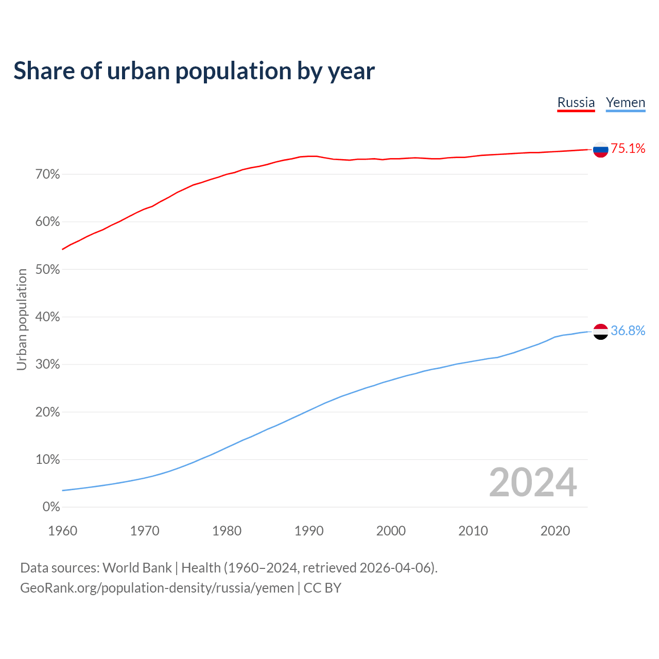 From 2004 to 2024, the share of urban population changed from 73.3% to 75.1% in Russia and from 28.5% to 36.8% in Yemen.