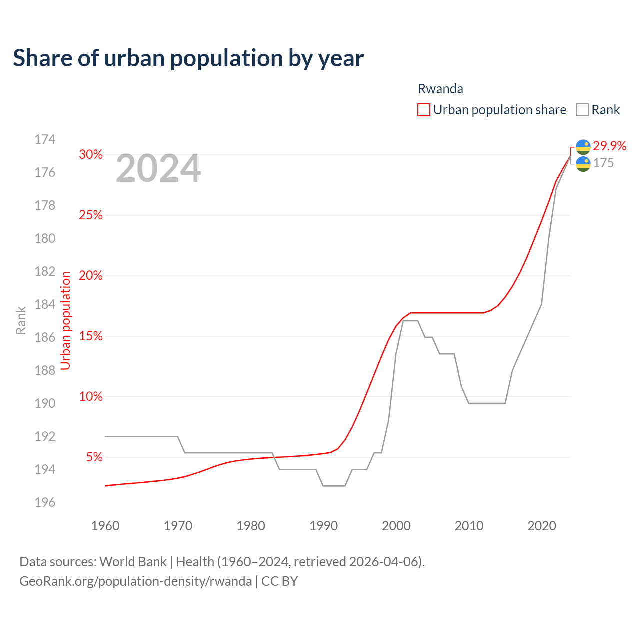 This chart shows the share of urban population in Rwanda from 1960 to 2024: 2.6% lived in urban areas in 1960, 15.8% in 2000, and 29.9% in 2024.