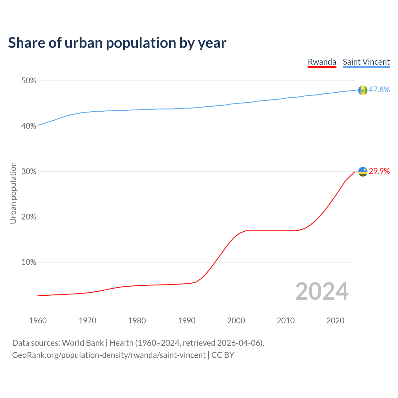 From 2004 to 2024, the share of urban population changed from 16.9% to 29.9% in Rwanda and from 45.4% to 47.8% in Saint Vincent.