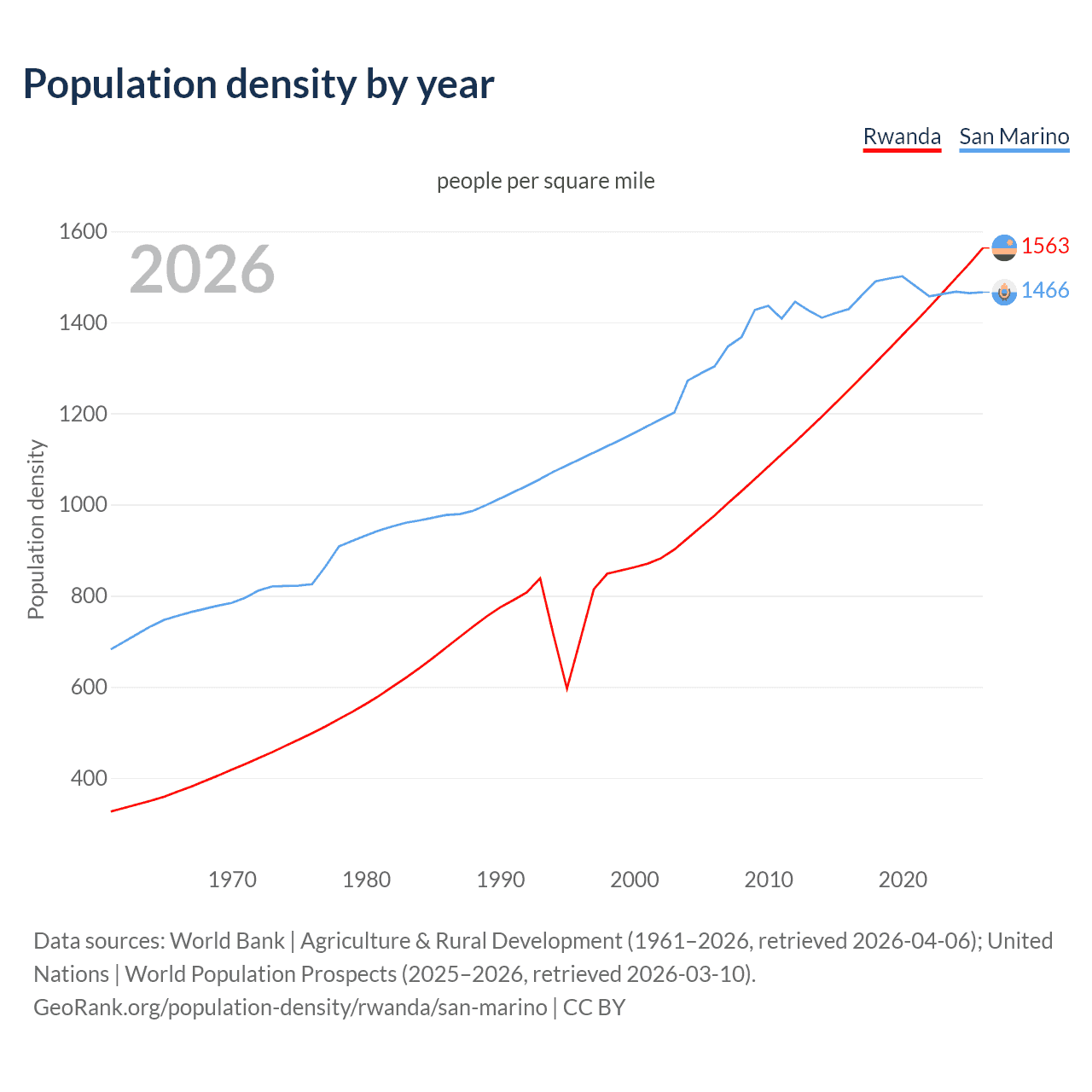 From 2006 to 2026, population density in Rwanda increased by 60.1%, compared to a 12.5% growth in San Marino.