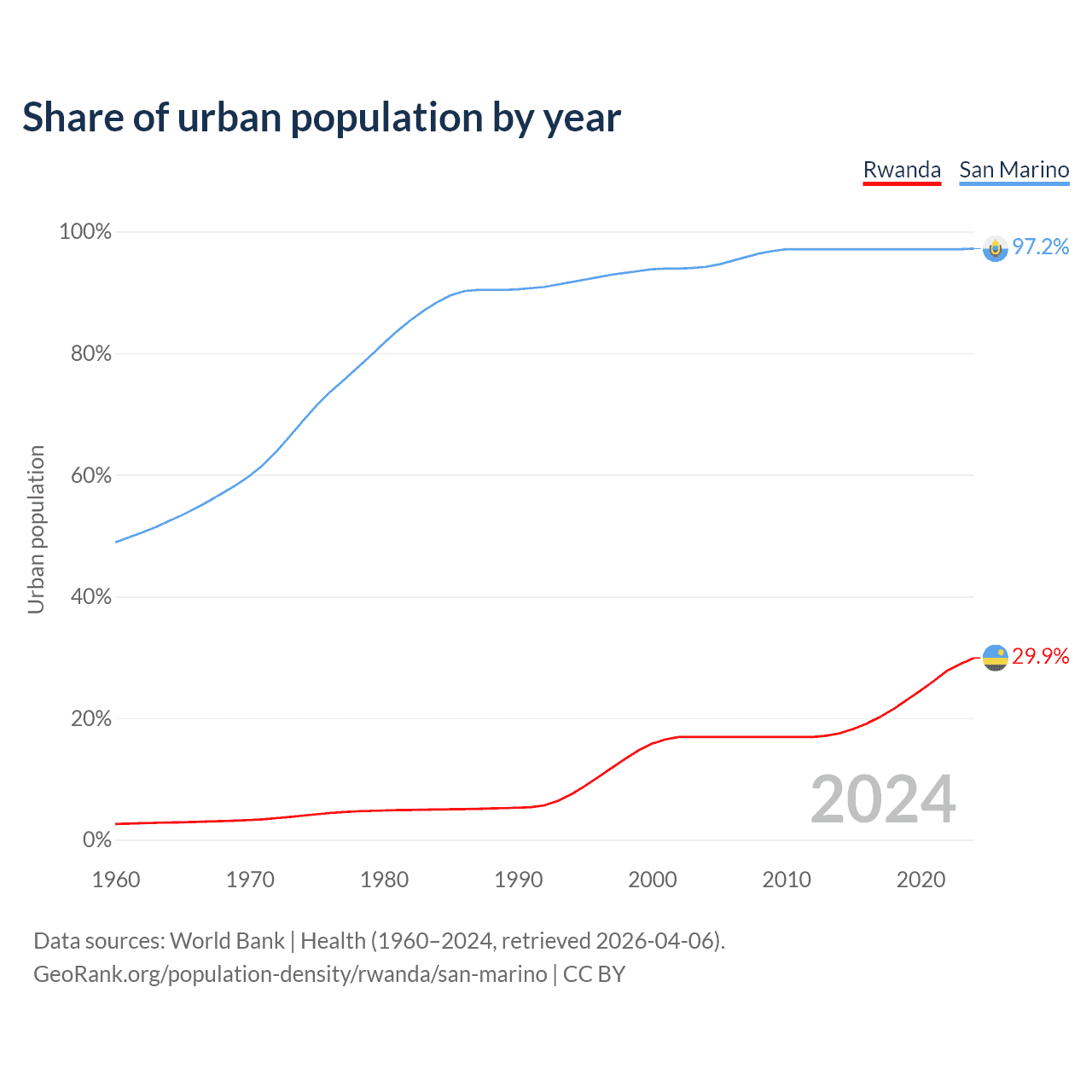 From 2004 to 2024, the share of urban population changed from 16.9% to 29.9% in Rwanda and from 94.2% to 97.2% in San Marino.