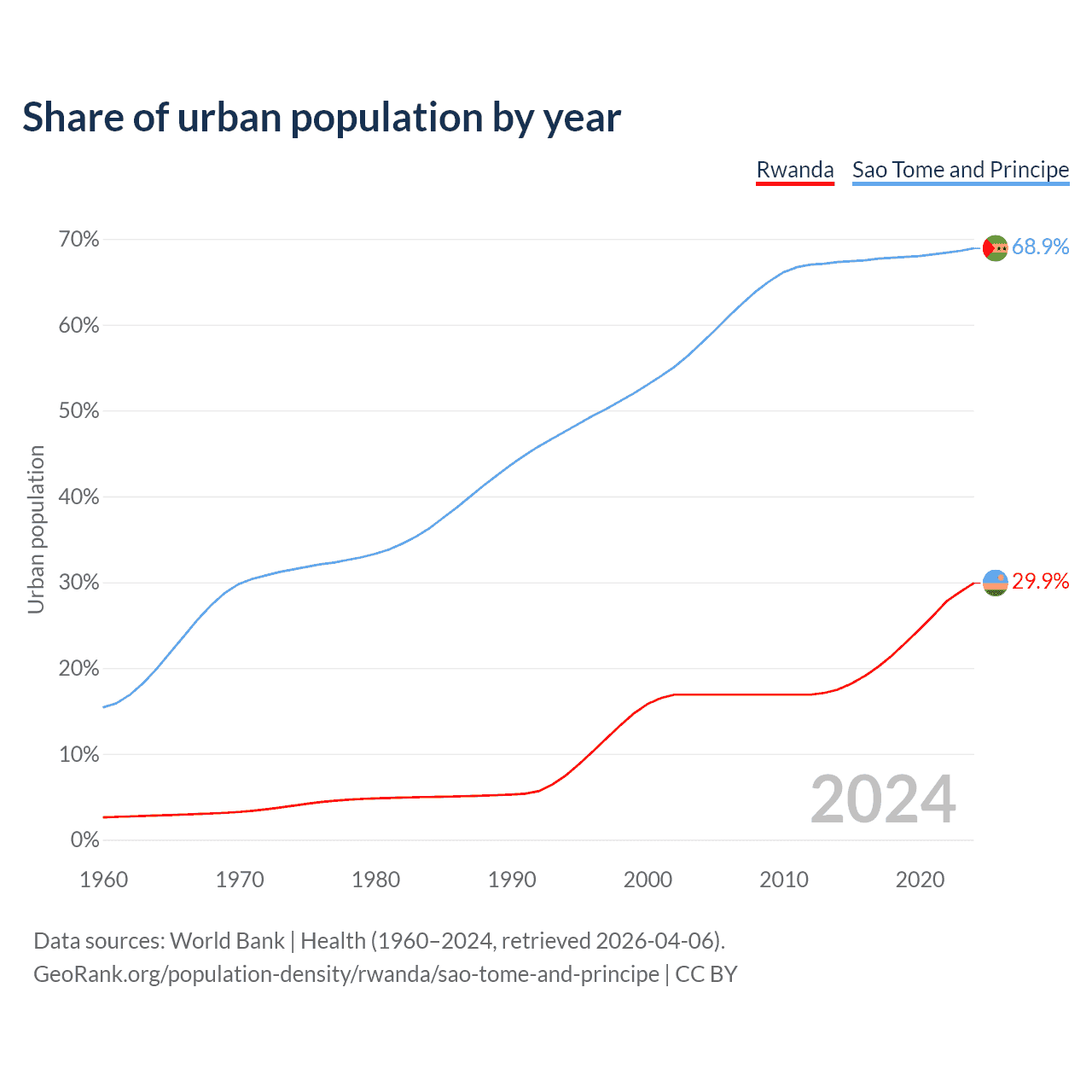 From 2004 to 2024, the share of urban population changed from 16.9% to 29.9% in Rwanda and from 57.9% to 68.9% in Sao Tome and Principe.