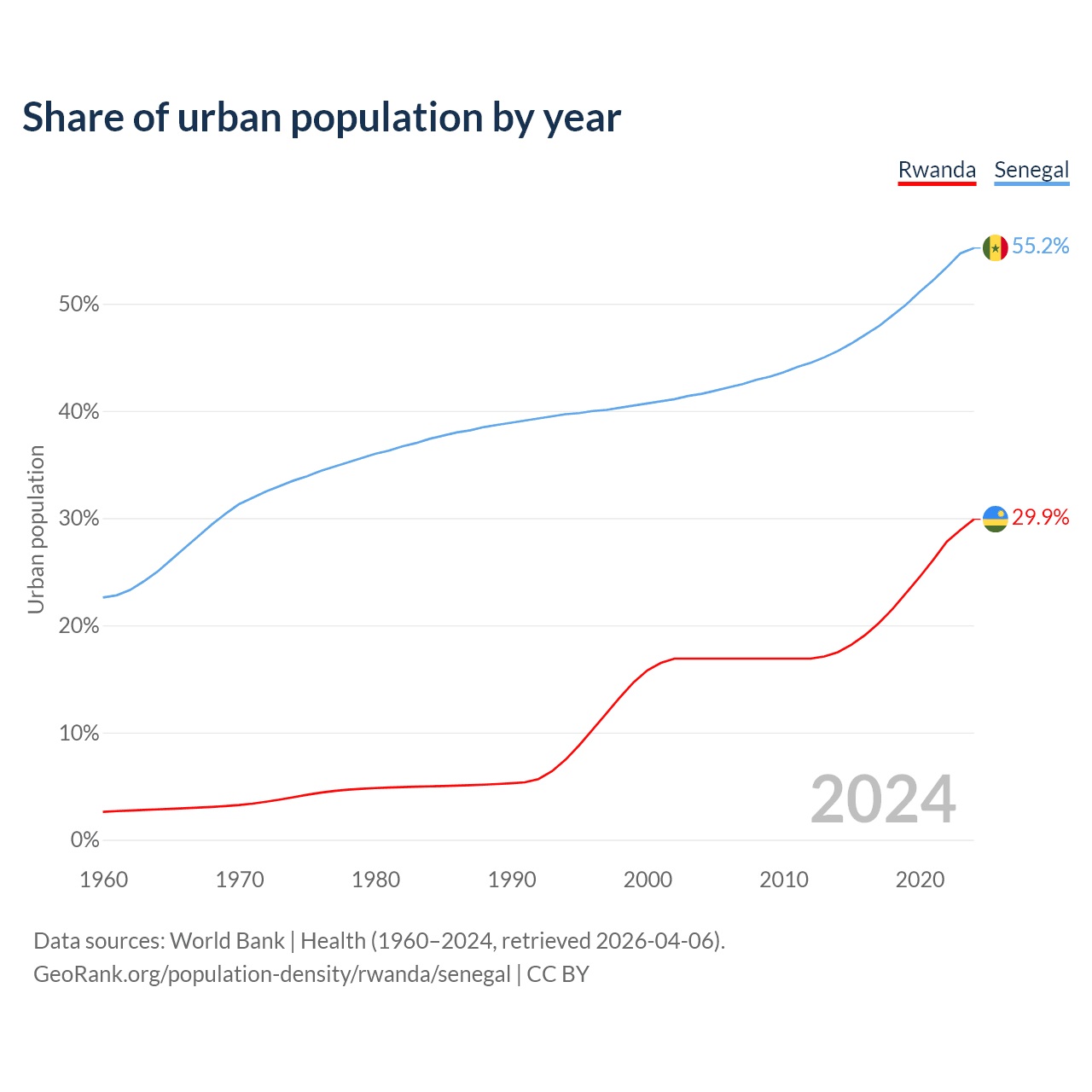 From 2004 to 2024, the share of urban population changed from 16.9% to 29.9% in Rwanda and from 41.6% to 55.2% in Senegal.