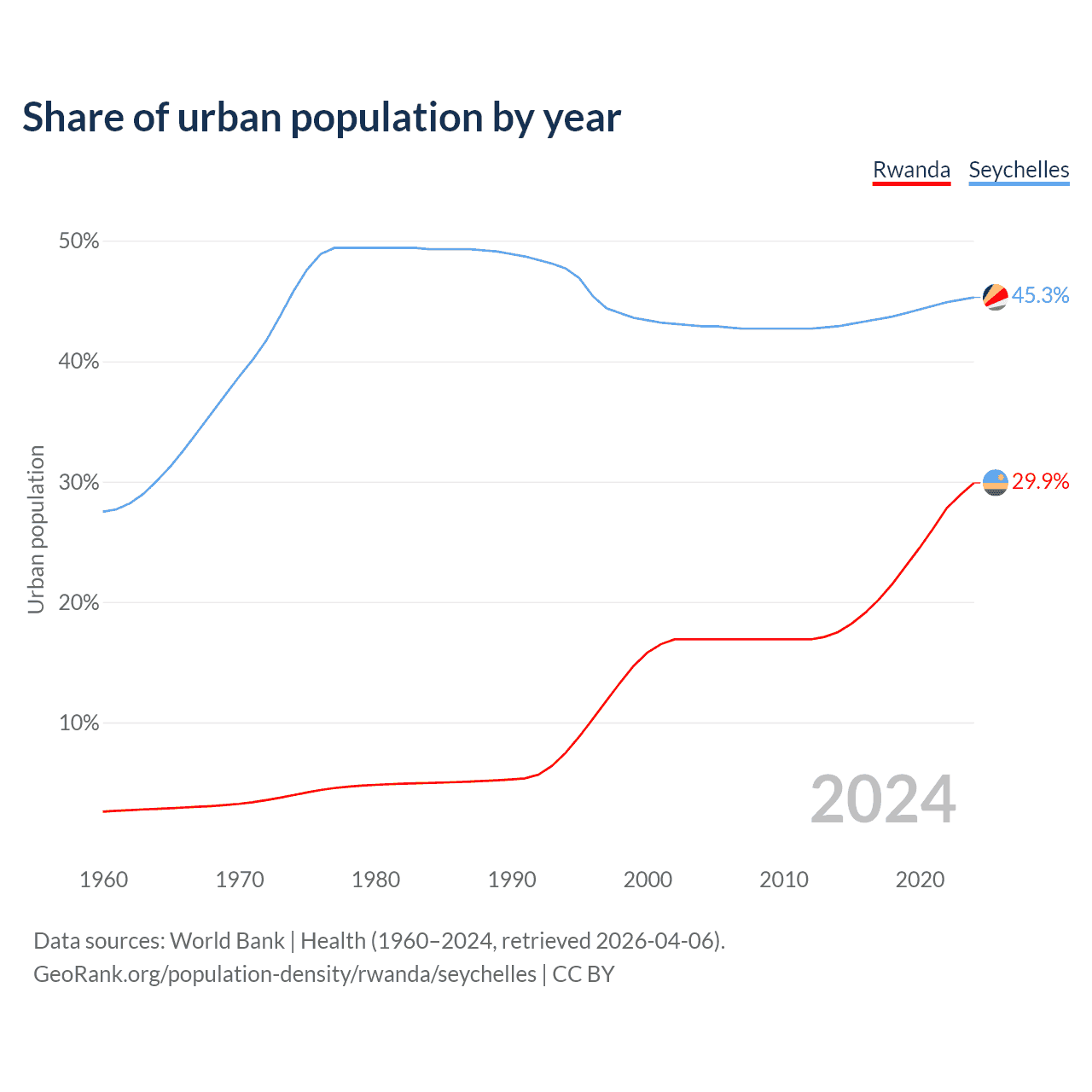 From 2004 to 2024, the share of urban population changed from 16.9% to 29.9% in Rwanda and from 42.9% to 45.3% in the Seychelles.