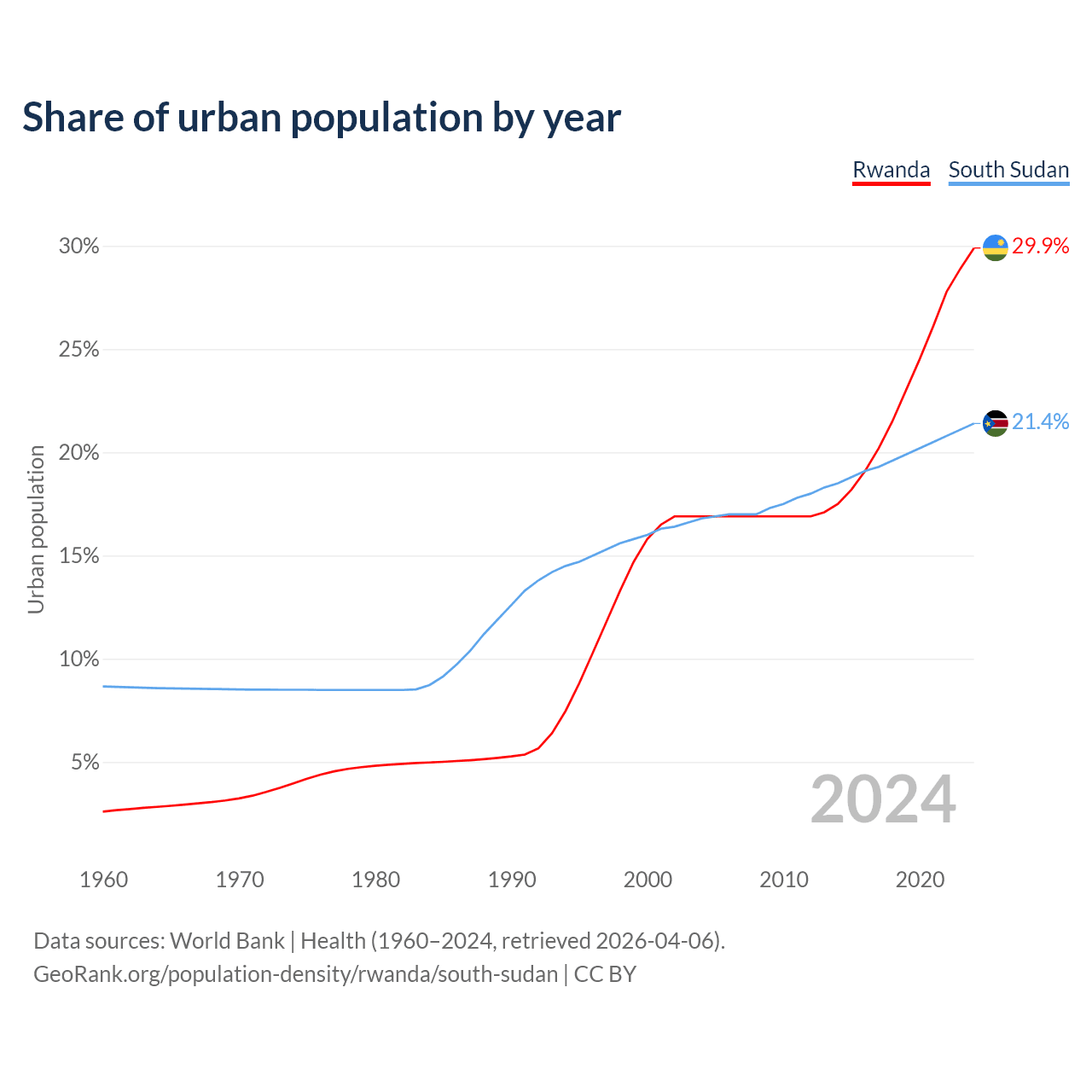 From 2004 to 2024, the share of urban population changed from 16.9% to 29.9% in Rwanda and from 16.8% to 21.4% in South Sudan.