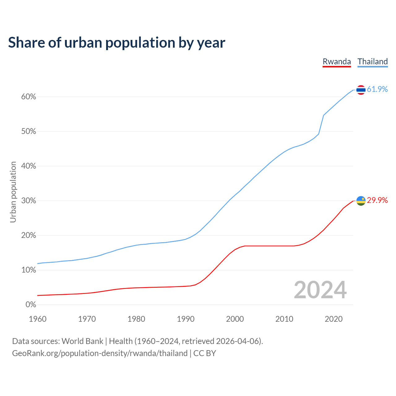 From 2004 to 2024, the share of urban population changed from 16.9% to 29.9% in Rwanda and from 36.8% to 61.9% in Thailand.