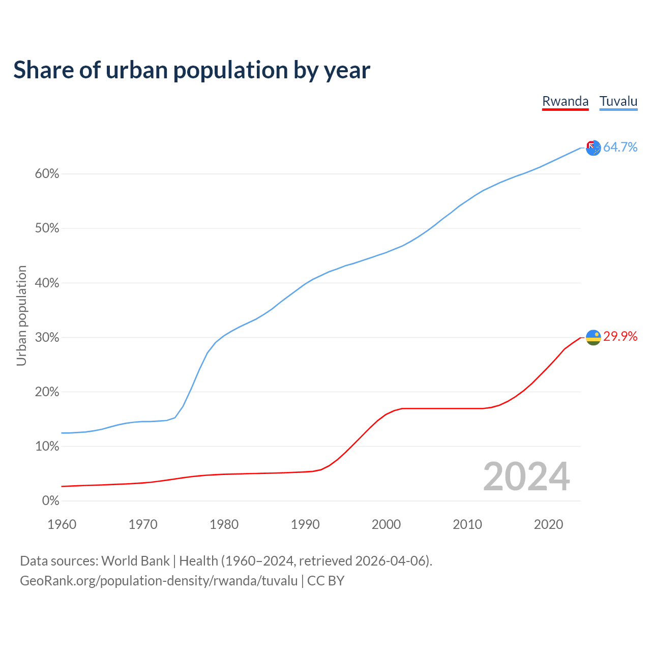 From 2004 to 2024, the share of urban population changed from 16.9% to 29.9% in Rwanda and from 48.4% to 64.7% in Tuvalu.