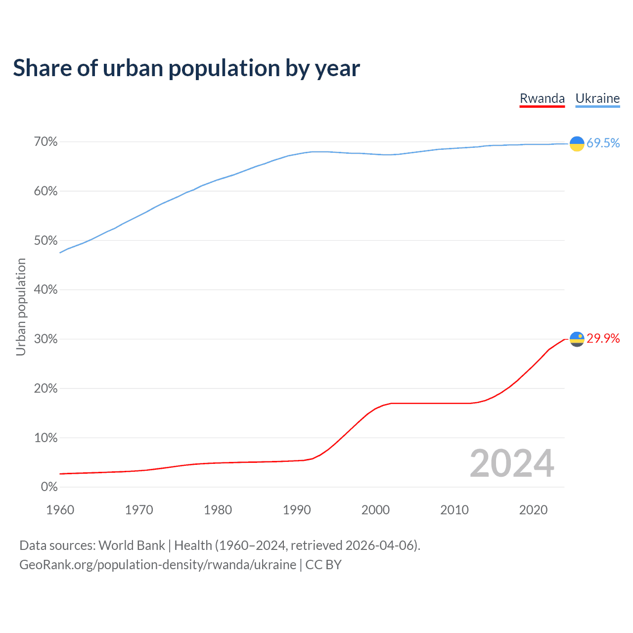 From 2004 to 2024, the share of urban population changed from 16.9% to 29.9% in Rwanda and from 67.6% to 69.5% in Ukraine.