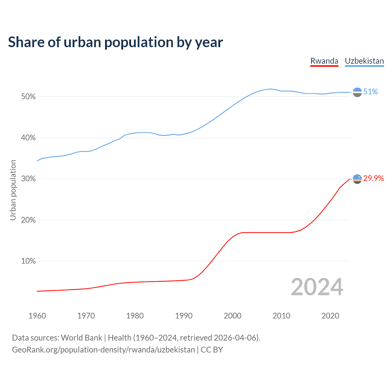 From 2004 to 2024, the share of urban population changed from 16.9% to 29.9% in Rwanda and from 50.6% to 51% in Uzbekistan.