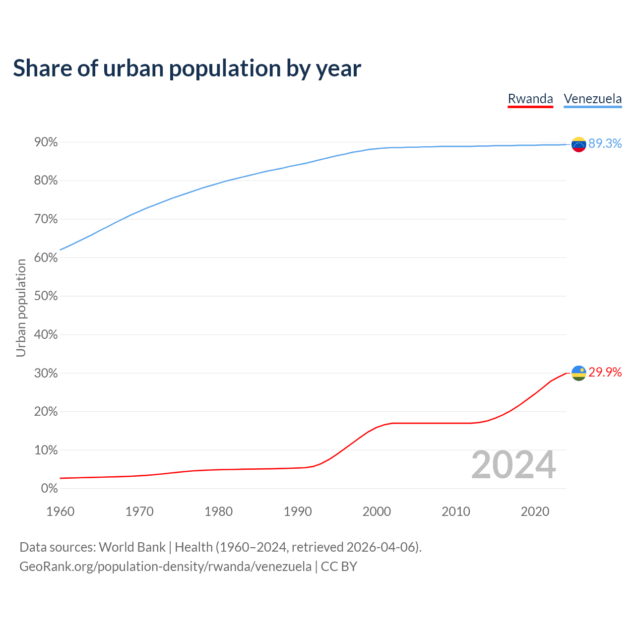 From 2004 to 2024, the share of urban population changed from 16.9% to 29.9% in Rwanda and from 88.6% to 89.3% in Venezuela.