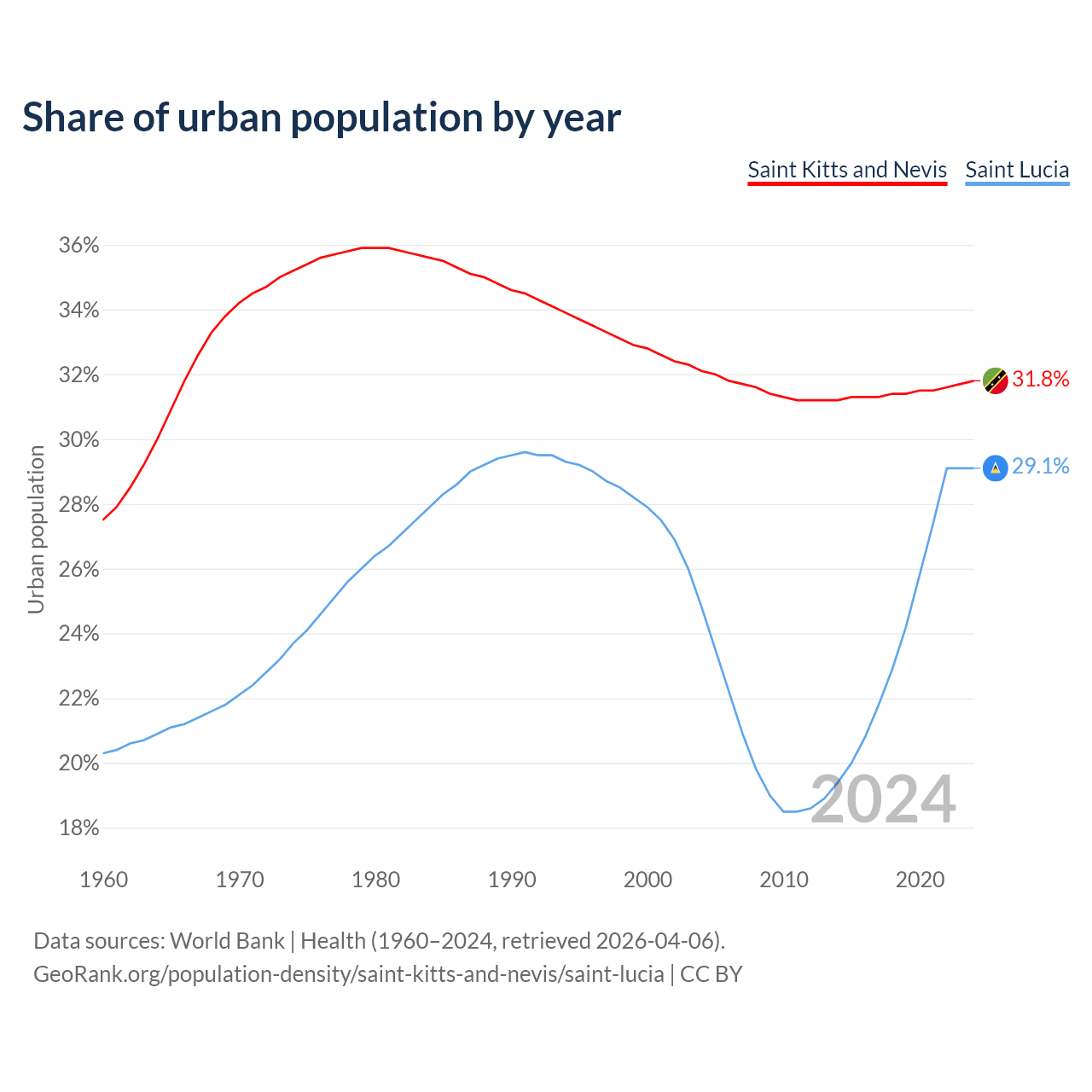 From 2004 to 2024, the share of urban population changed from 32.1% to 31.8% in Saint Kitts and Nevis and from 24.8% to 29.1% in Saint Lucia.