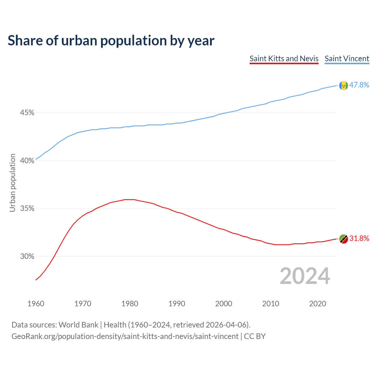 From 2004 to 2024, the share of urban population changed from 32.1% to 31.8% in Saint Kitts and Nevis and from 45.4% to 47.8% in Saint Vincent.