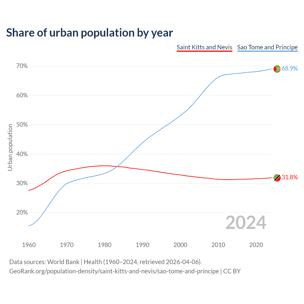 From 2004 to 2024, the share of urban population changed from 32.1% to 31.8% in Saint Kitts and Nevis and from 57.9% to 68.9% in Sao Tome and Principe.