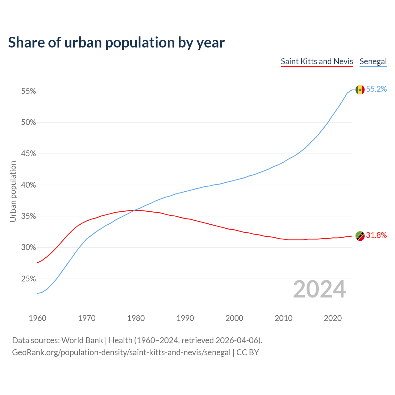 From 2004 to 2024, the share of urban population changed from 32.1% to 31.8% in Saint Kitts and Nevis and from 41.6% to 55.2% in Senegal.