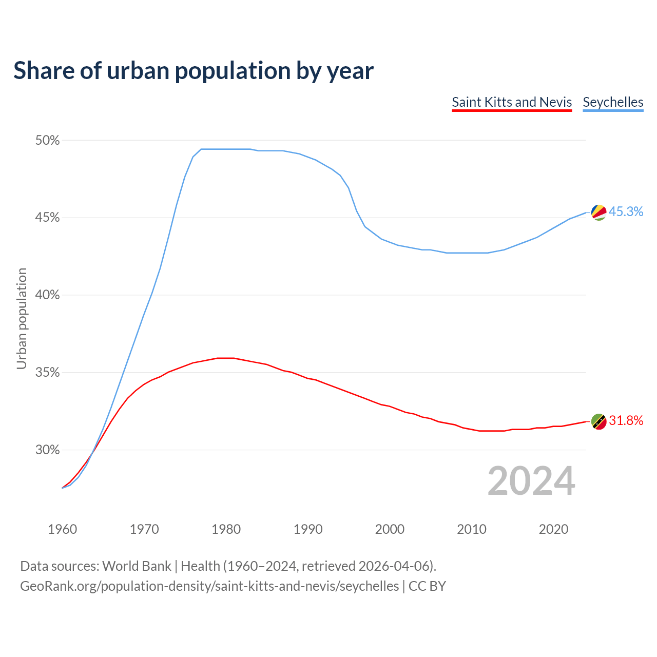 From 2004 to 2024, the share of urban population changed from 32.1% to 31.8% in Saint Kitts and Nevis and from 42.9% to 45.3% in the Seychelles.