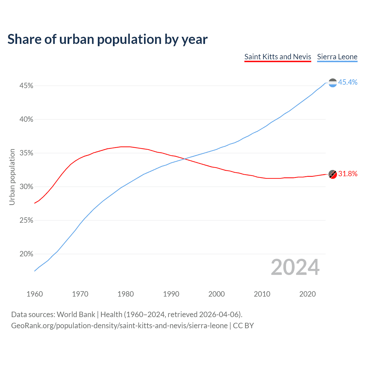 From 2004 to 2024, the share of urban population changed from 32.1% to 31.8% in Saint Kitts and Nevis and from 36.5% to 45.4% in Sierra Leone.