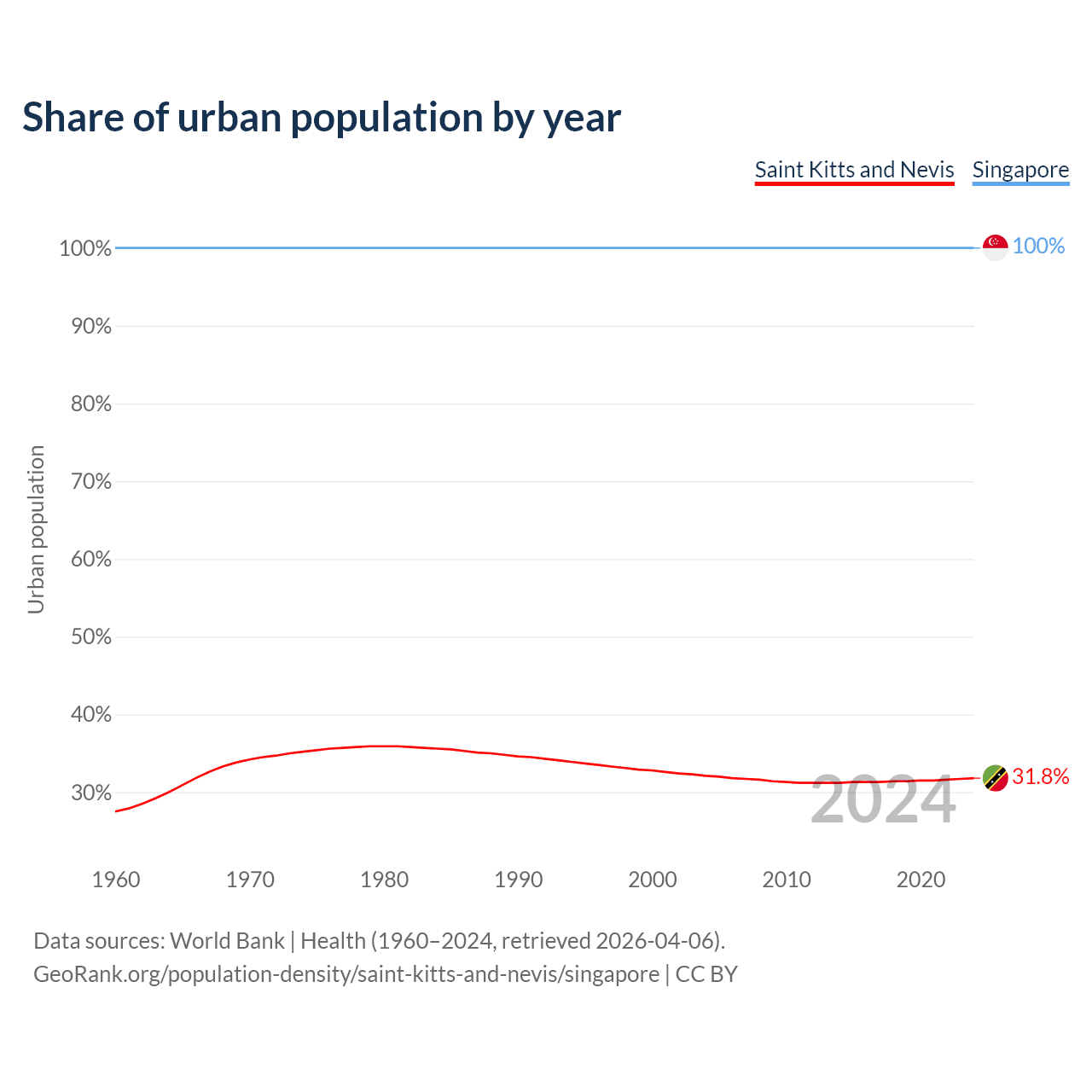 From 2004 to 2024, the share of urban population changed from 32.1% to 31.8% in Saint Kitts and Nevis and from 100% to 100% in Singapore.