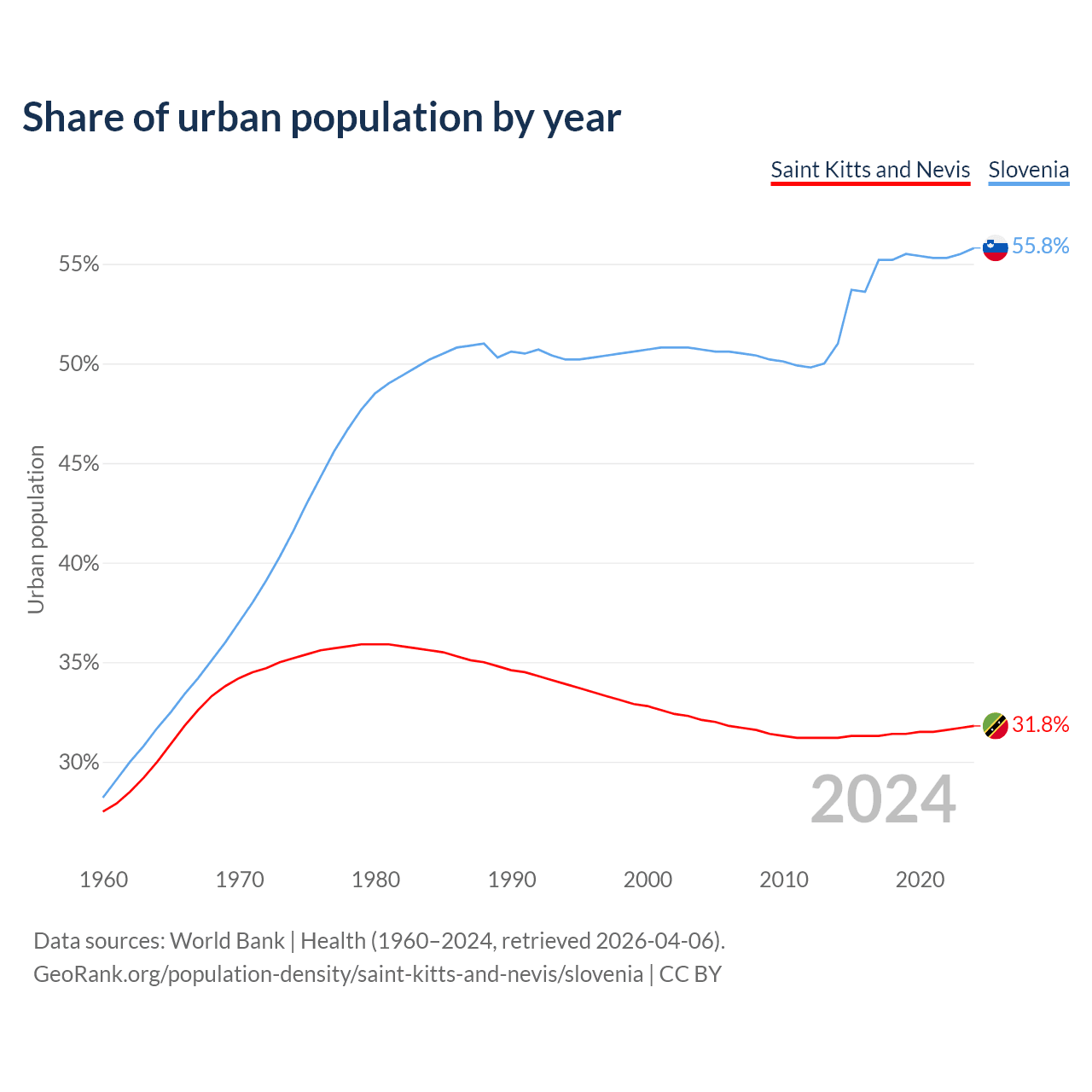 From 2004 to 2024, the share of urban population changed from 32.1% to 31.8% in Saint Kitts and Nevis and from 50.7% to 55.8% in Slovenia.