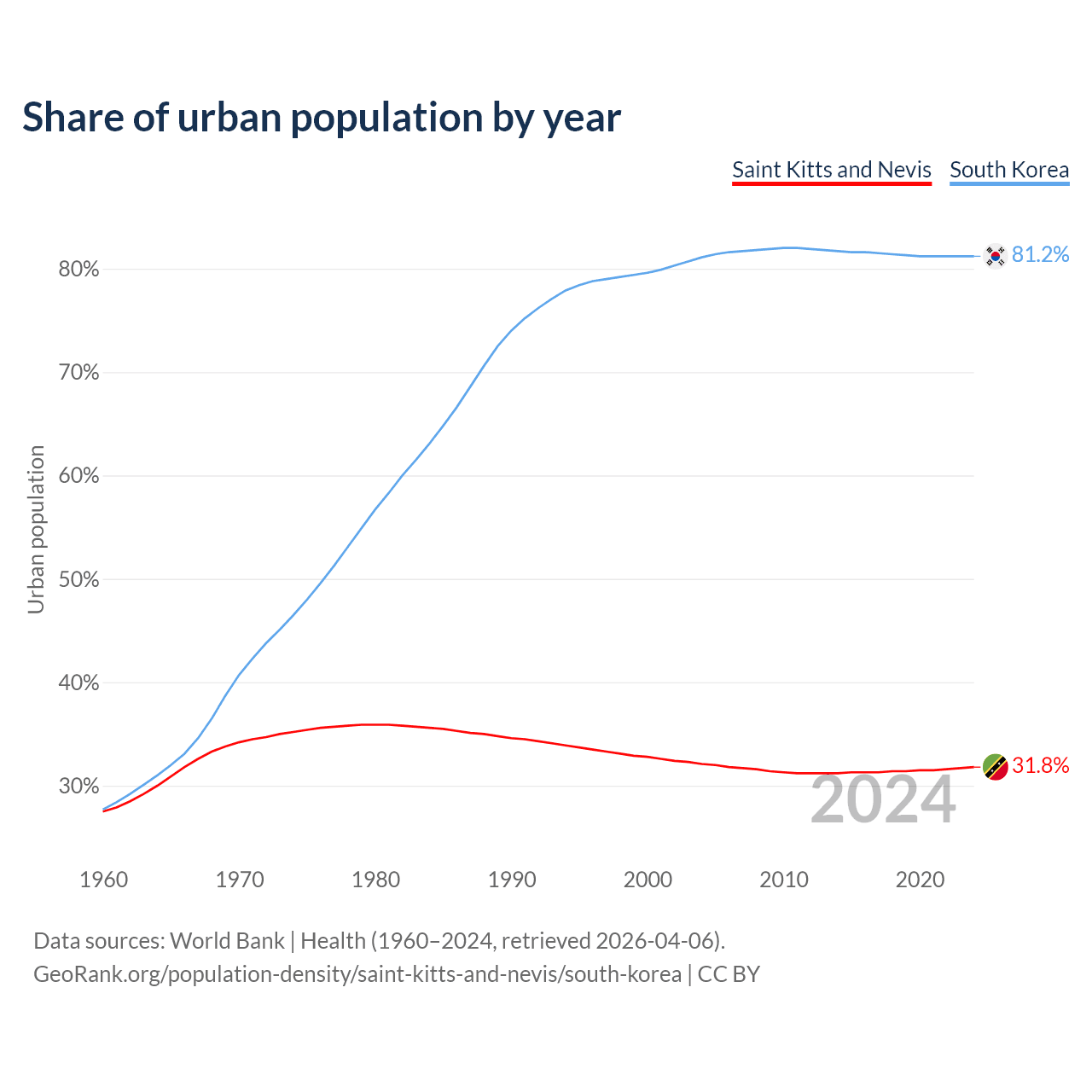 From 2004 to 2024, the share of urban population changed from 32.1% to 31.8% in Saint Kitts and Nevis and from 81.1% to 81.2% in South Korea.