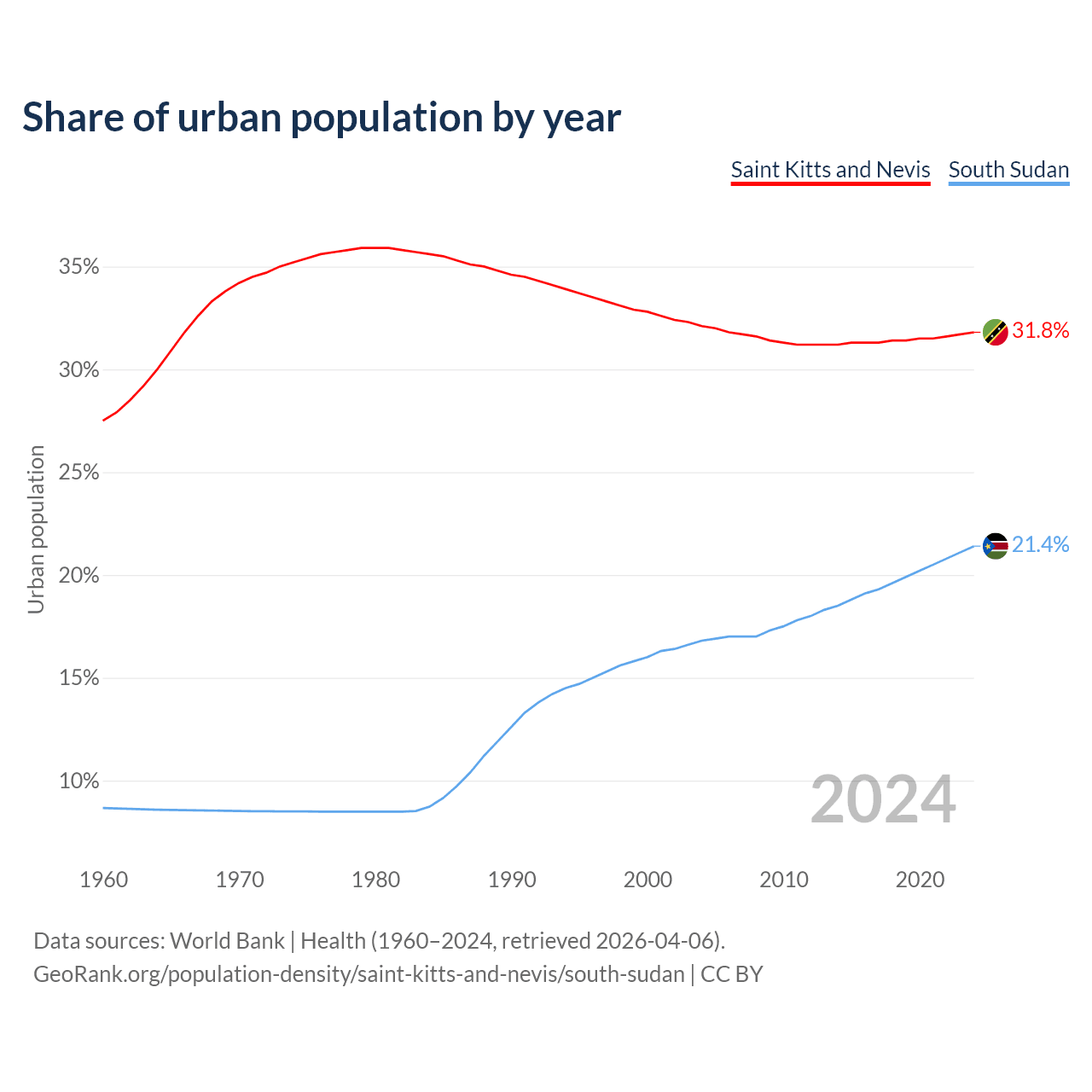 From 2004 to 2024, the share of urban population changed from 32.1% to 31.8% in Saint Kitts and Nevis and from 16.8% to 21.4% in South Sudan.