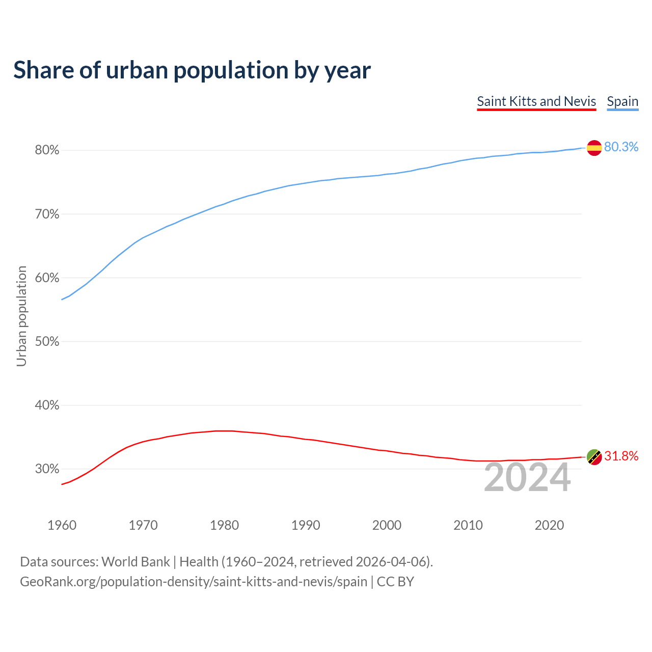 From 2004 to 2024, the share of urban population changed from 32.1% to 31.8% in Saint Kitts and Nevis and from 77% to 80.3% in Spain.