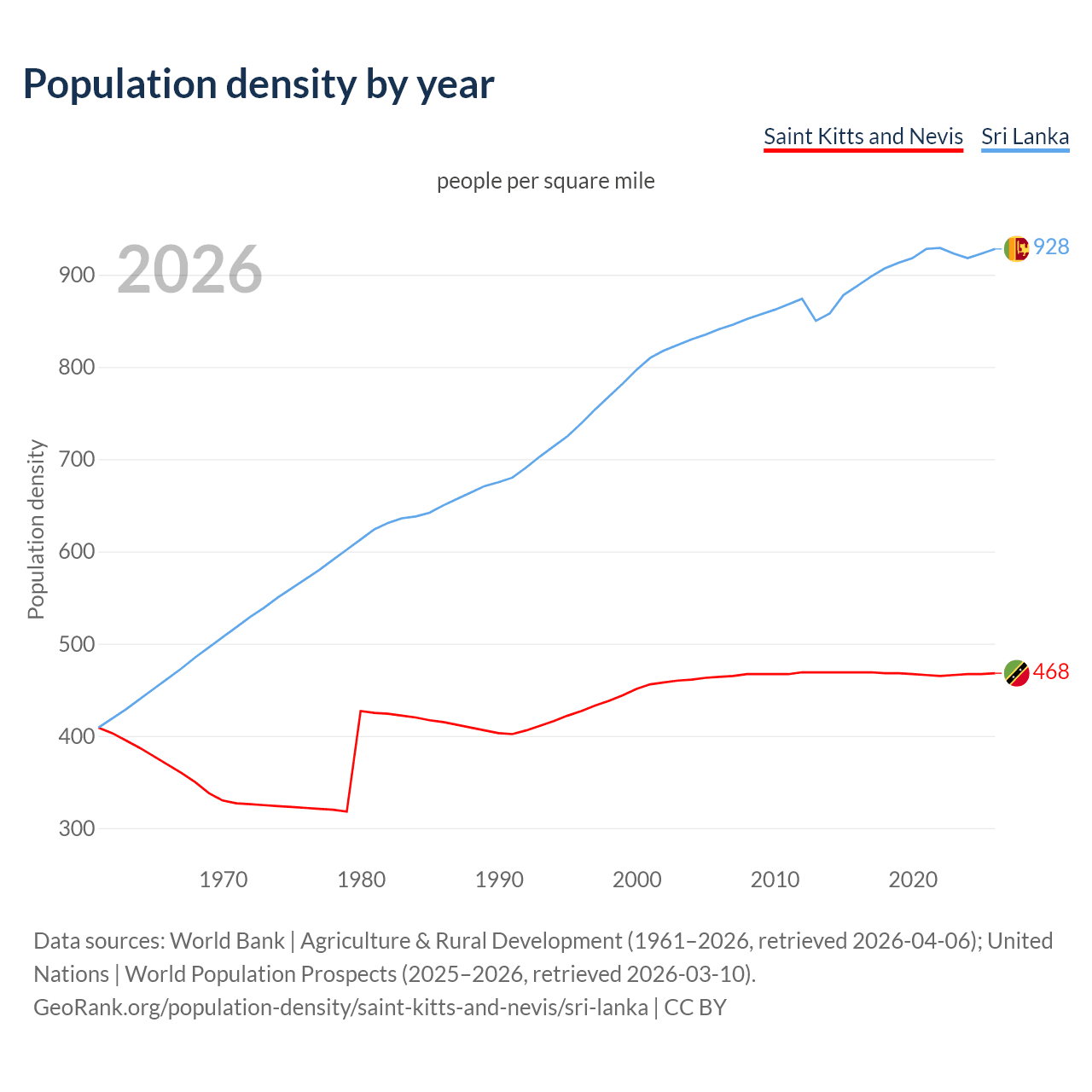 From 2006 to 2026, population density in Saint Kitts and Nevis increased by 0.93%, compared to a 10.4% growth in Sri Lanka.