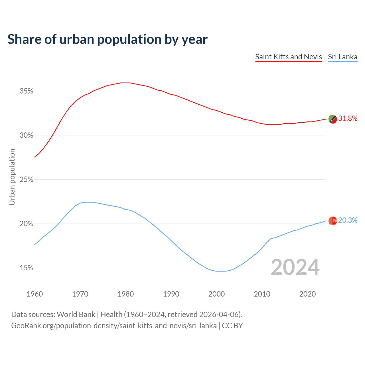 From 2004 to 2024, the share of urban population changed from 32.1% to 31.8% in Saint Kitts and Nevis and from 14.9% to 20.3% in Sri Lanka.