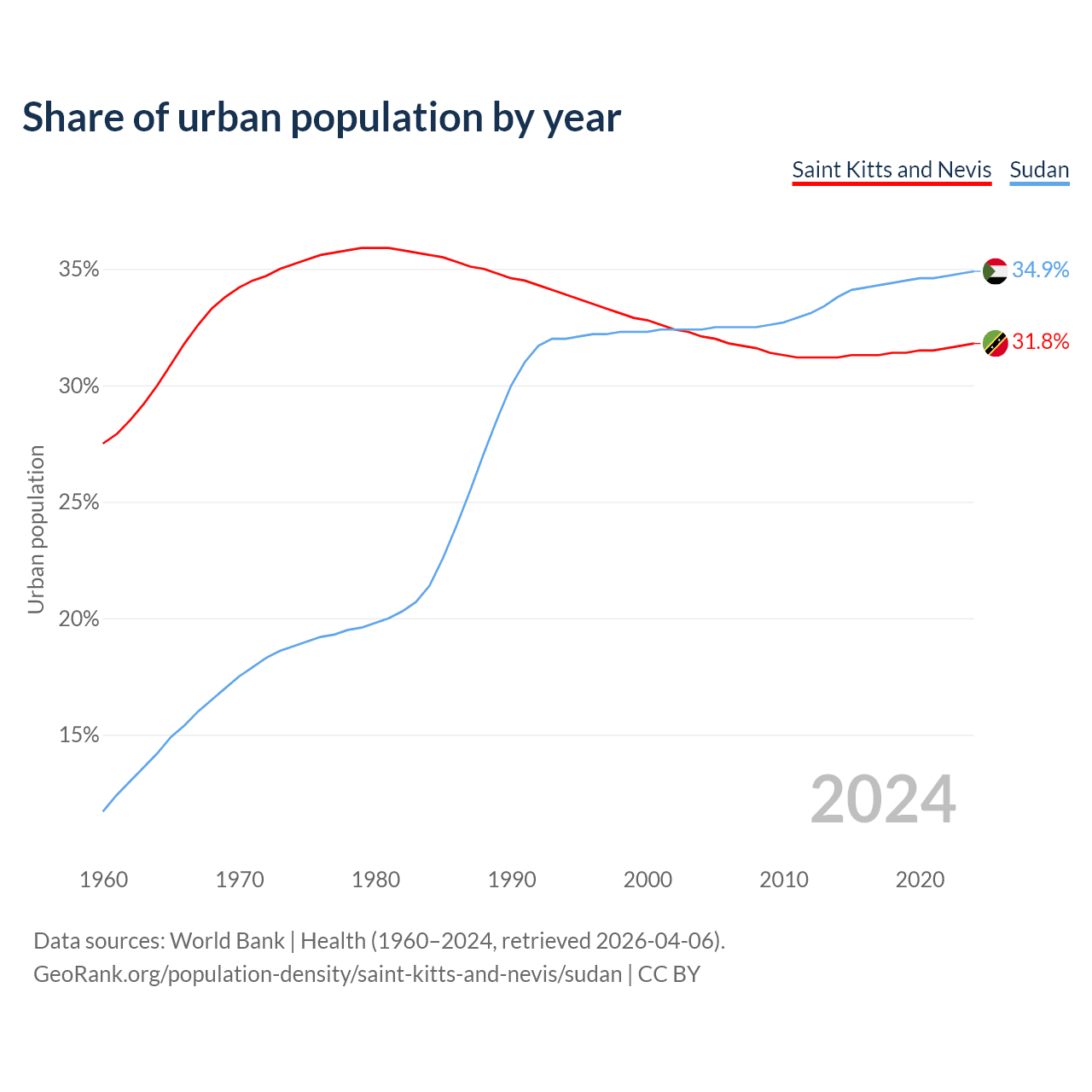 From 2004 to 2024, the share of urban population changed from 32.1% to 31.8% in Saint Kitts and Nevis and from 32.4% to 34.9% in Sudan.