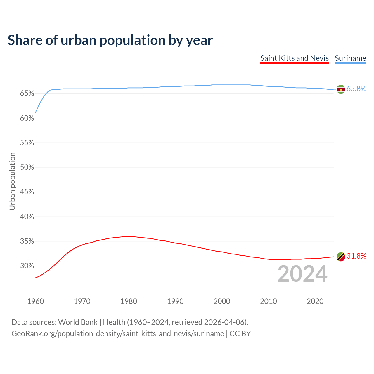 From 2004 to 2024, the share of urban population changed from 32.1% to 31.8% in Saint Kitts and Nevis and from 66.7% to 65.8% in Suriname.