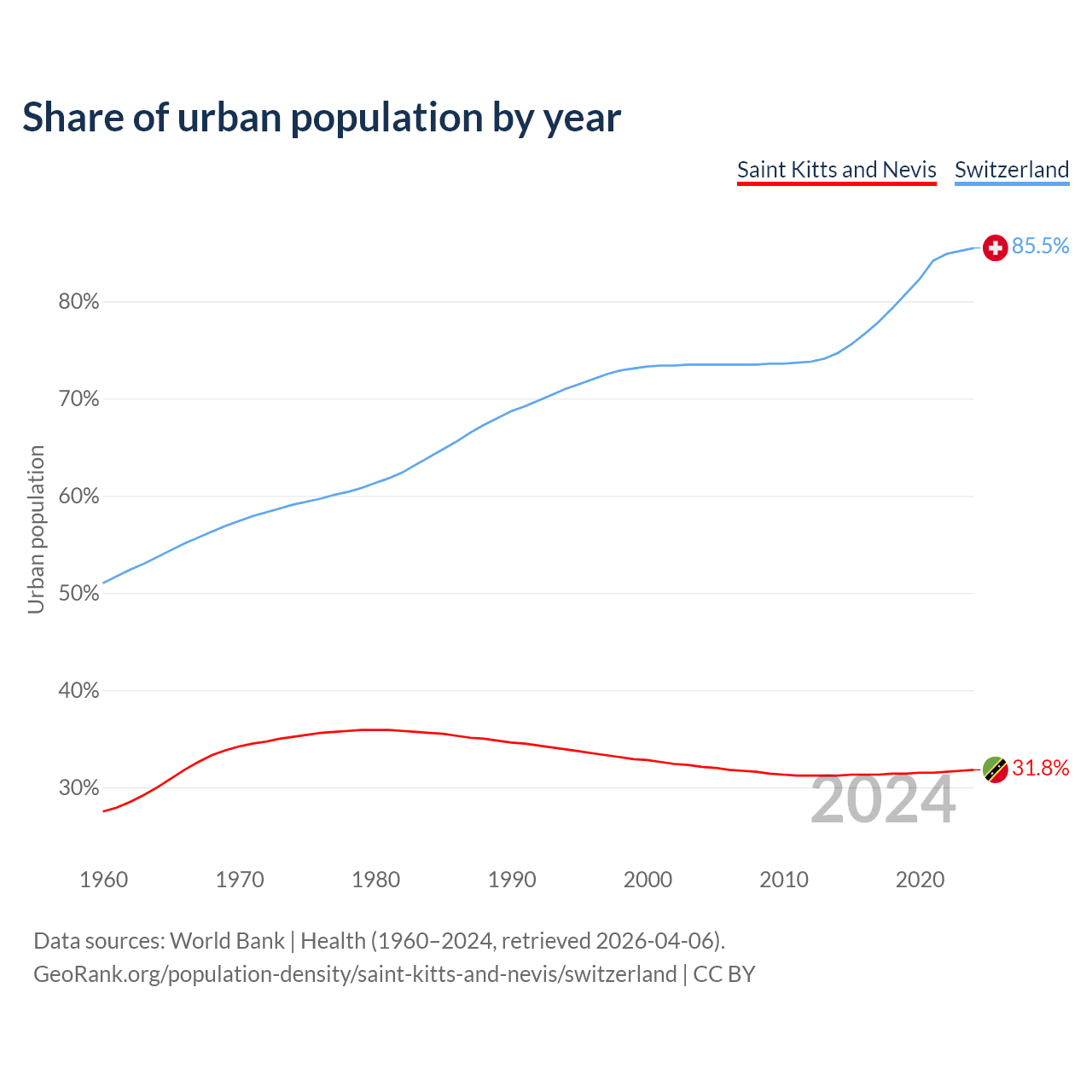 From 2004 to 2024, the share of urban population changed from 32.1% to 31.8% in Saint Kitts and Nevis and from 73.5% to 85.5% in Switzerland.