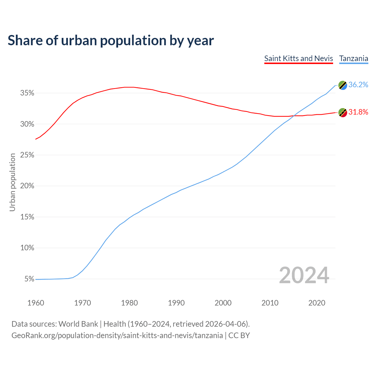 From 2004 to 2024, the share of urban population changed from 32.1% to 31.8% in Saint Kitts and Nevis and from 24.1% to 36.2% in Tanzania.