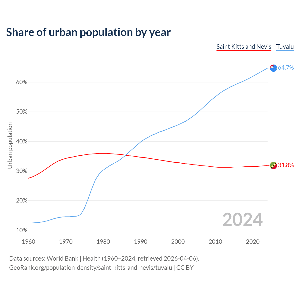 From 2004 to 2024, the share of urban population changed from 32.1% to 31.8% in Saint Kitts and Nevis and from 48.4% to 64.7% in Tuvalu.