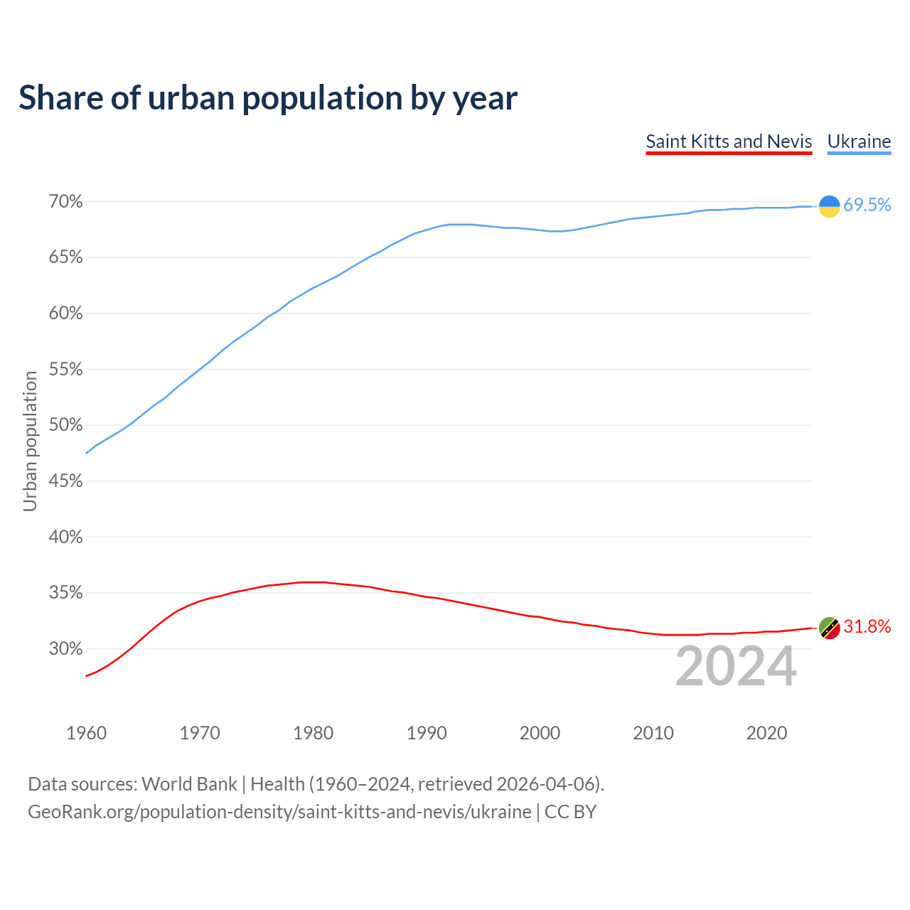 From 2004 to 2024, the share of urban population changed from 32.1% to 31.8% in Saint Kitts and Nevis and from 67.6% to 69.5% in Ukraine.