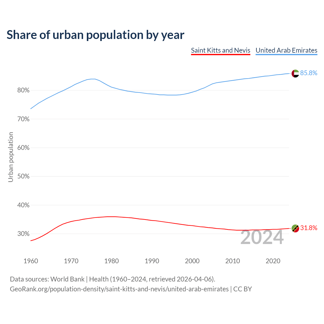 From 2004 to 2024, the share of urban population changed from 32.1% to 31.8% in Saint Kitts and Nevis and from 81.5% to 85.8% in the United Arab Emirates.