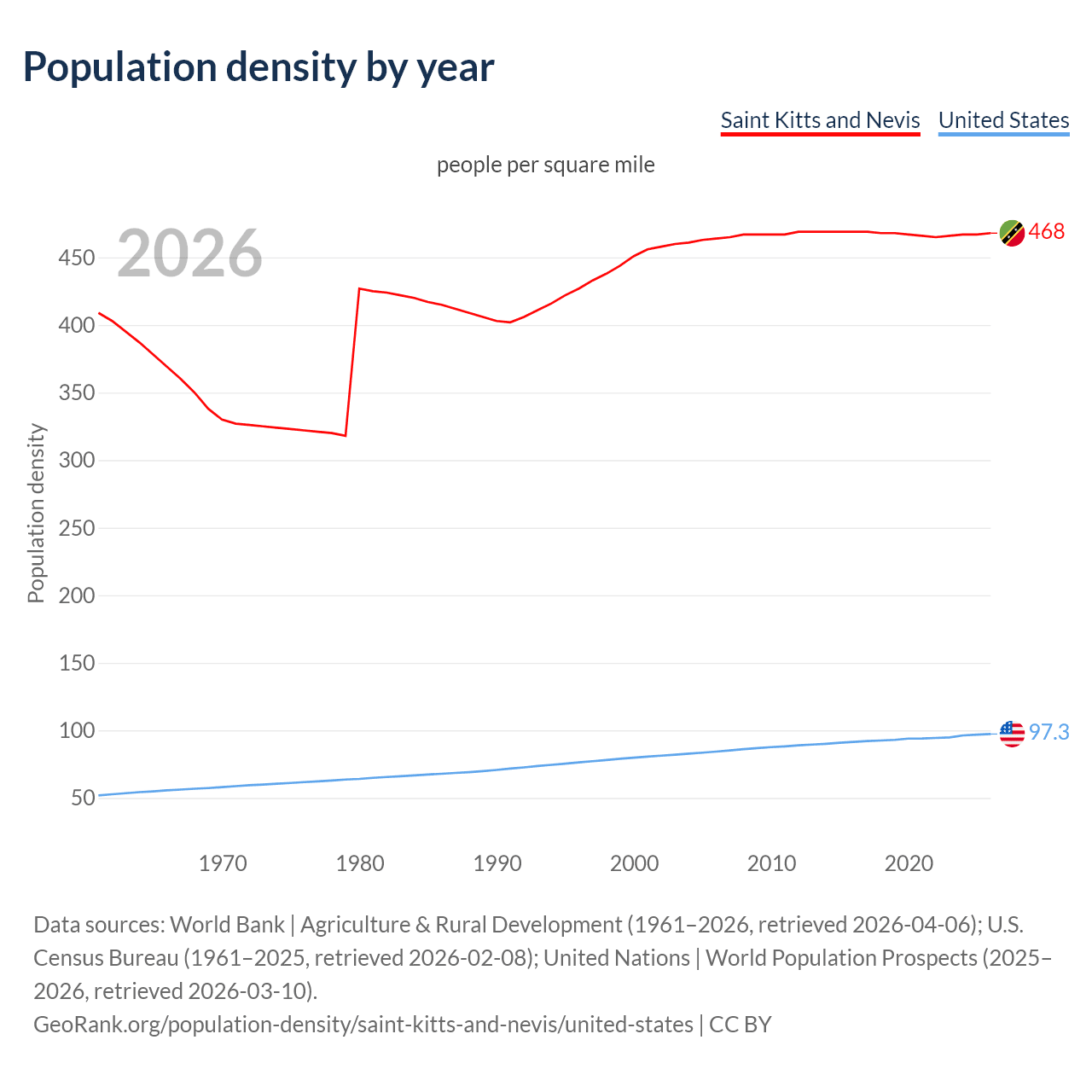 From 2006 to 2026, population density in Saint Kitts and Nevis increased by 0.93%, compared to a 15.3% growth in the United States.