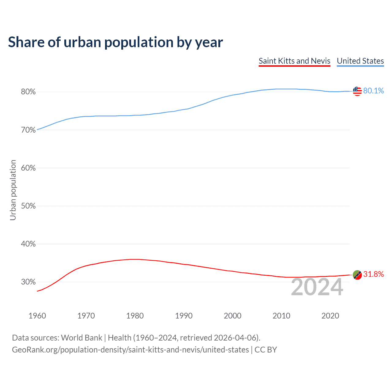 From 2004 to 2024, the share of urban population changed from 32.1% to 31.8% in Saint Kitts and Nevis and from 80% to 80.1% in the United States.