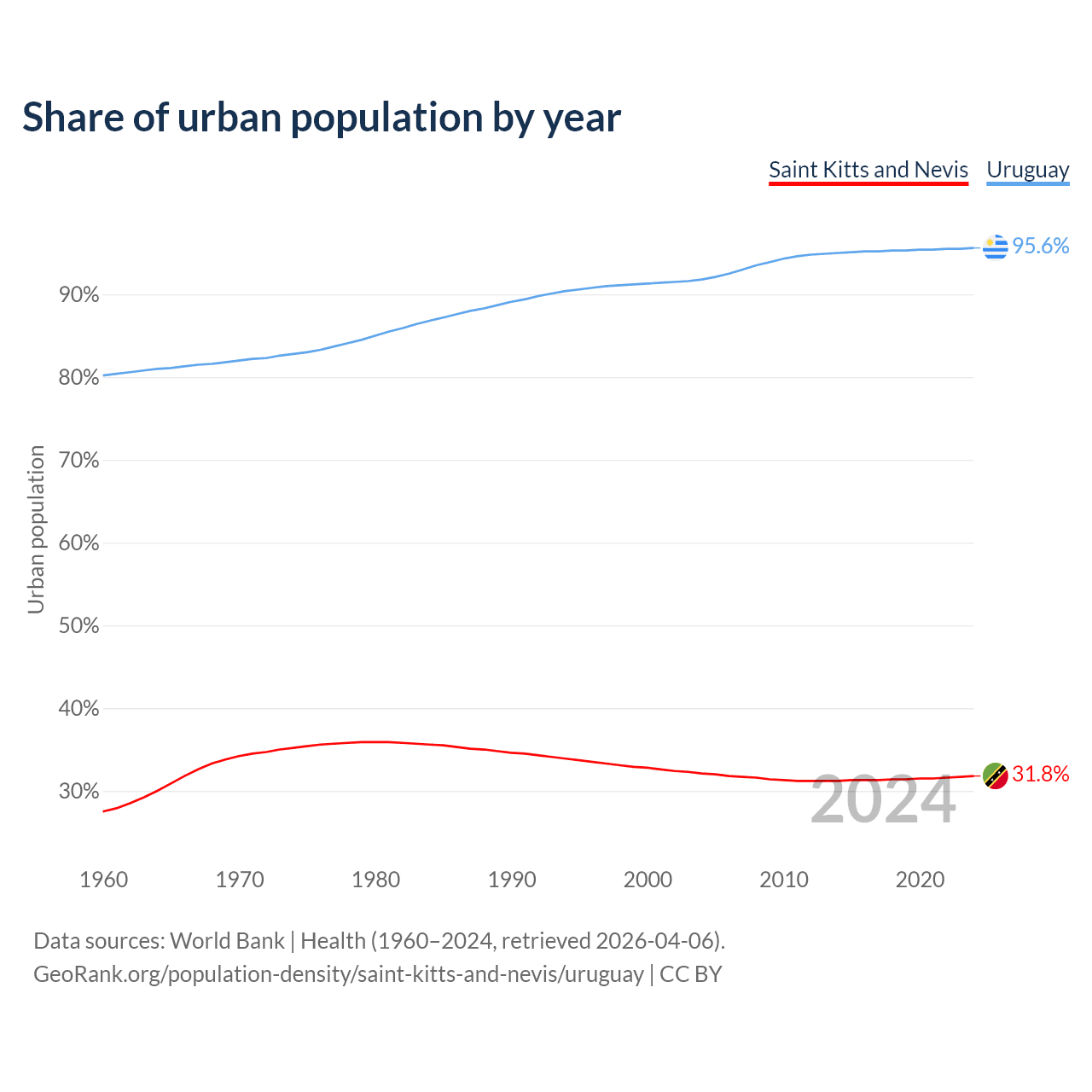 From 2004 to 2024, the share of urban population changed from 32.1% to 31.8% in Saint Kitts and Nevis and from 91.8% to 95.6% in Uruguay.