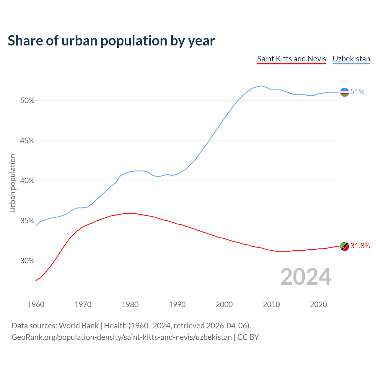 From 2004 to 2024, the share of urban population changed from 32.1% to 31.8% in Saint Kitts and Nevis and from 50.6% to 51% in Uzbekistan.