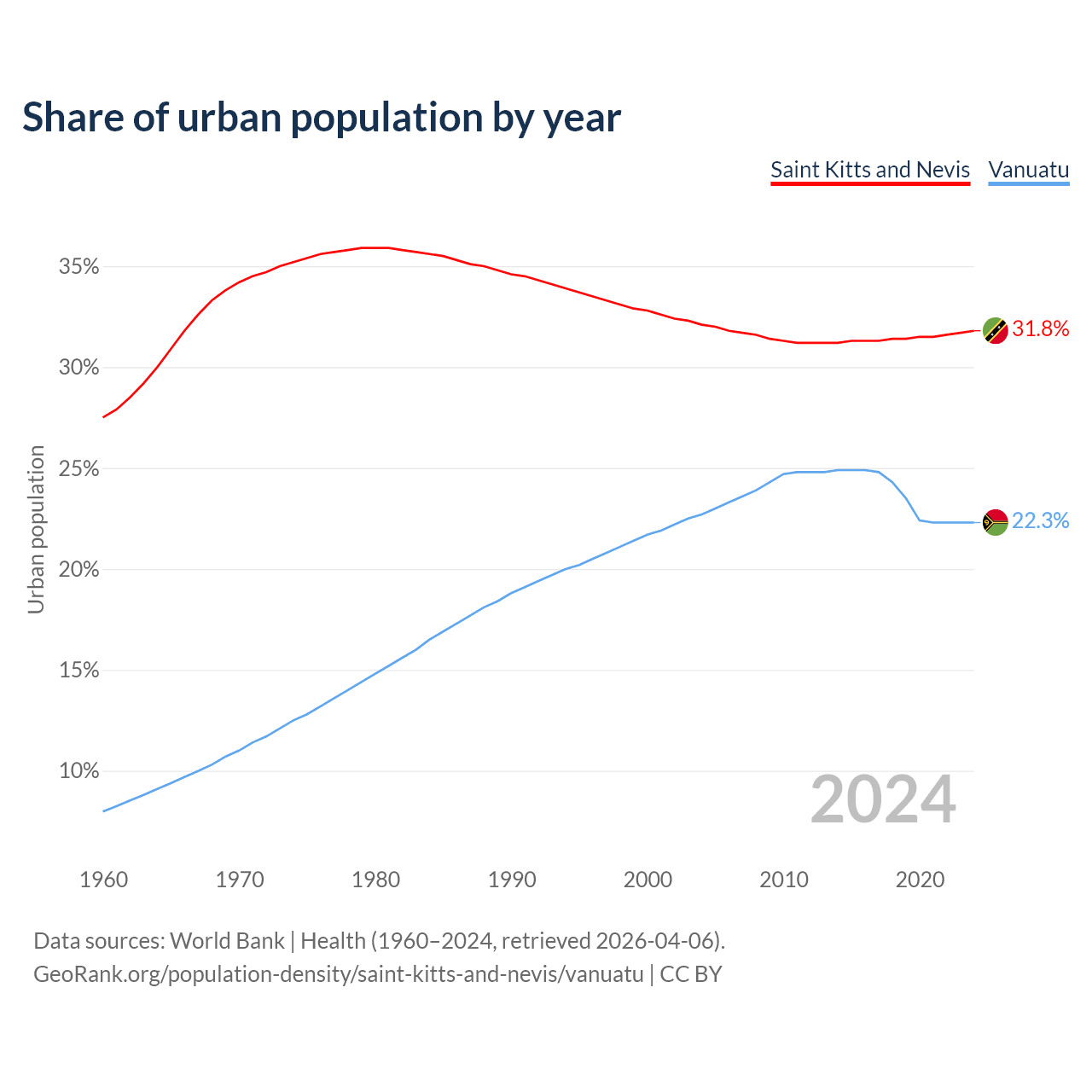 From 2004 to 2024, the share of urban population changed from 32.1% to 31.8% in Saint Kitts and Nevis and from 22.7% to 22.3% in Vanuatu.