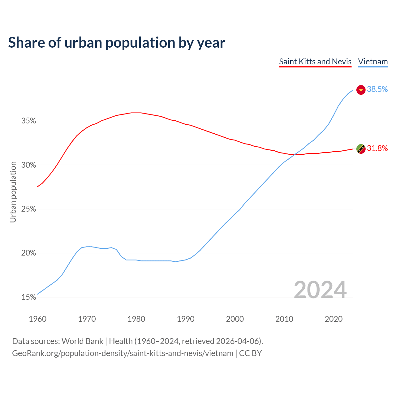 From 2004 to 2024, the share of urban population changed from 32.1% to 31.8% in Saint Kitts and Nevis and from 26.8% to 38.5% in Vietnam.