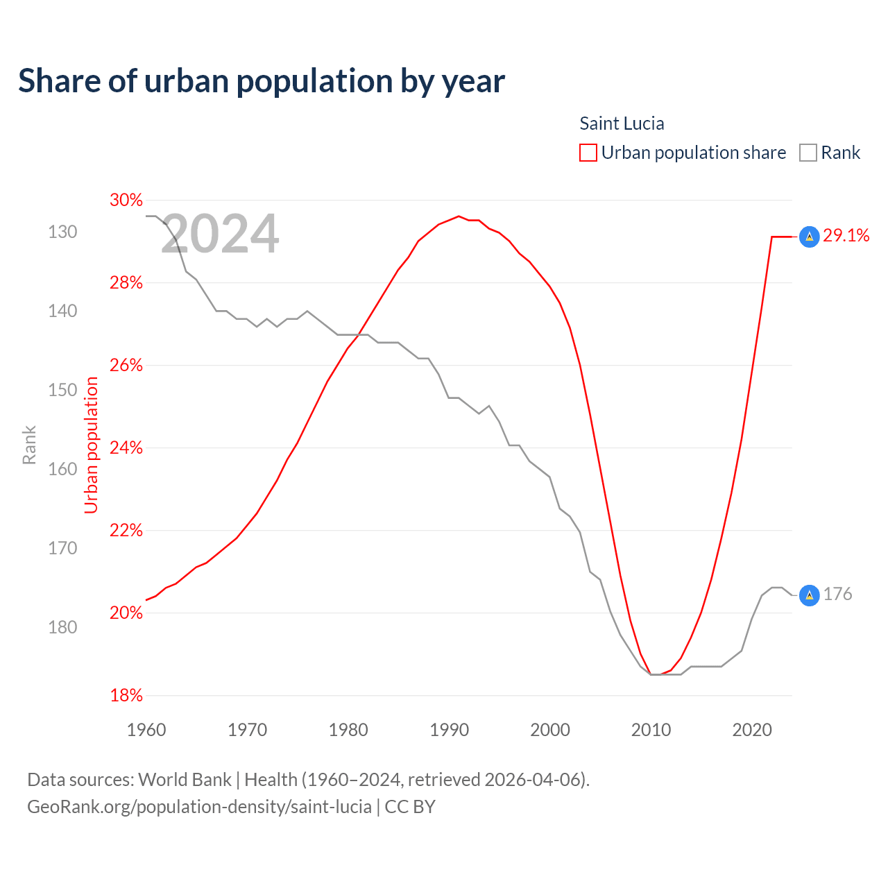 This chart shows the share of urban population in Saint Lucia from 1960 to 2024: 20.3% lived in urban areas in 1960, 27.9% in 2000, and 29.1% in 2024.
