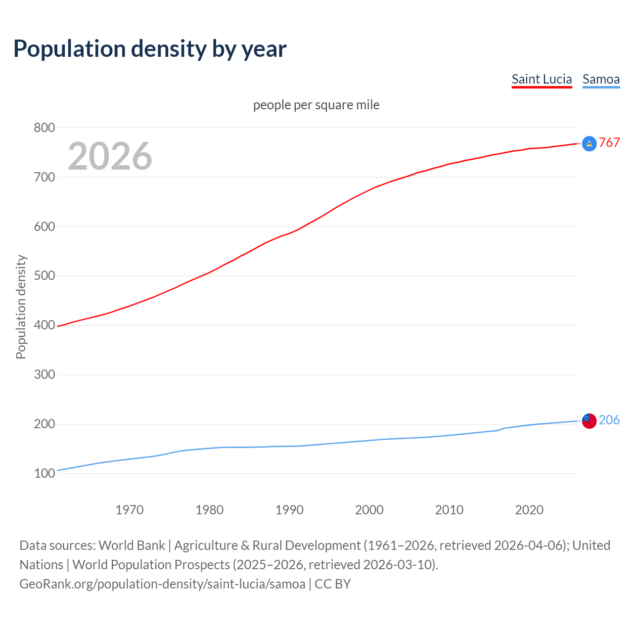 From 2006 to 2026, population density in Saint Lucia increased by 8.35%, compared to a 19.6% growth in Samoa.