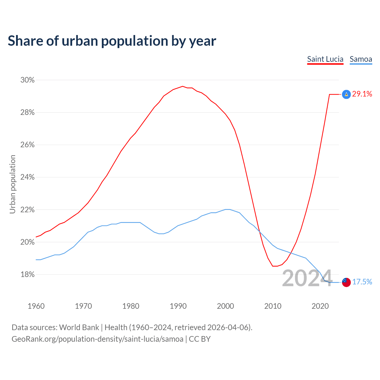 From 2004 to 2024, the share of urban population changed from 24.8% to 29.1% in Saint Lucia and from 21.5% to 17.5% in Samoa.