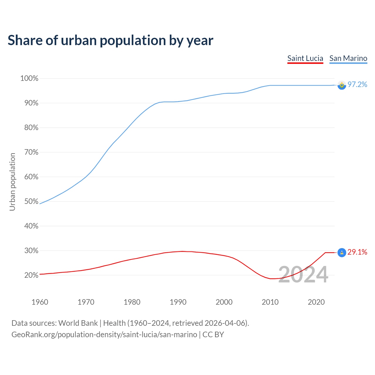 From 2004 to 2024, the share of urban population changed from 24.8% to 29.1% in Saint Lucia and from 94.2% to 97.2% in San Marino.
