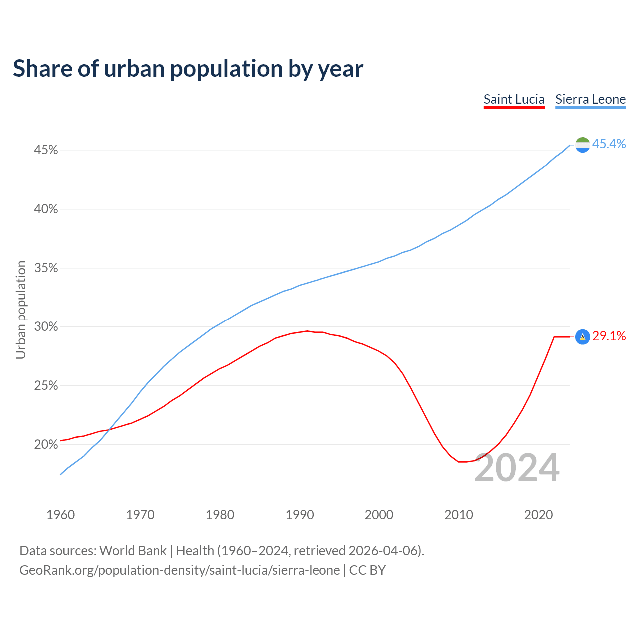 From 2004 to 2024, the share of urban population changed from 24.8% to 29.1% in Saint Lucia and from 36.5% to 45.4% in Sierra Leone.