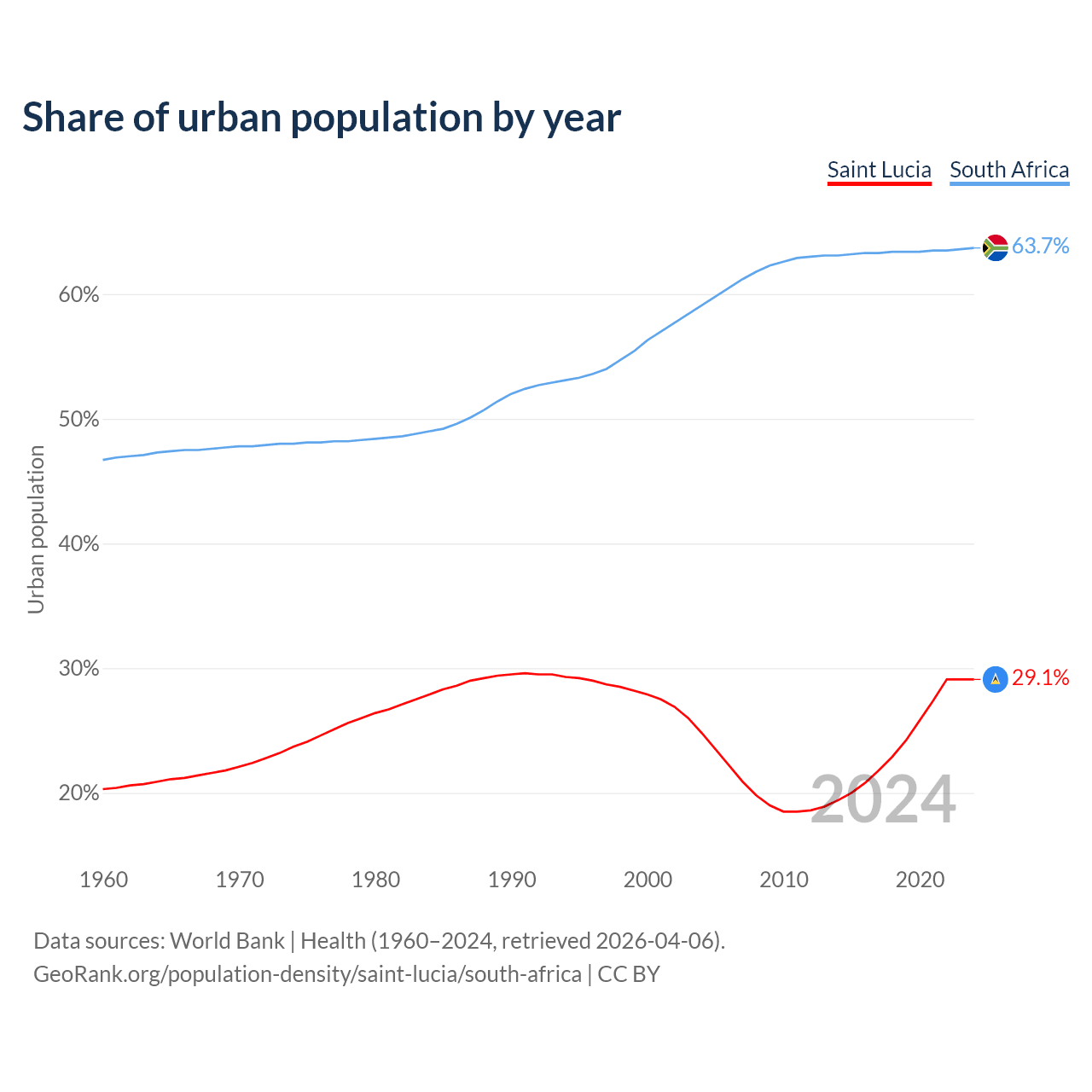 From 2004 to 2024, the share of urban population changed from 24.8% to 29.1% in Saint Lucia and from 59.1% to 63.7% in South Africa.